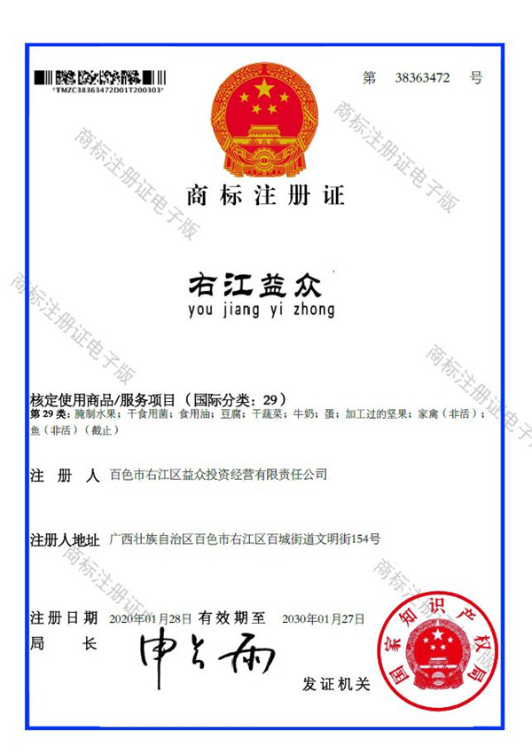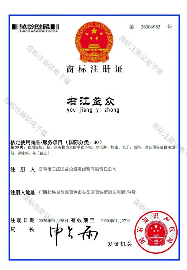日前,廣西百色益眾投資有限公司注冊的“右江益眾”品牌商標正式獲得國家知識產(chǎn)權(quán)局批準,為企業(yè)樹立品牌形象,推進企業(yè)品牌升級提供了有力抓手。