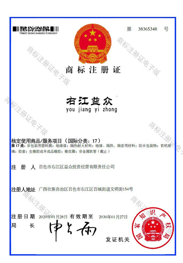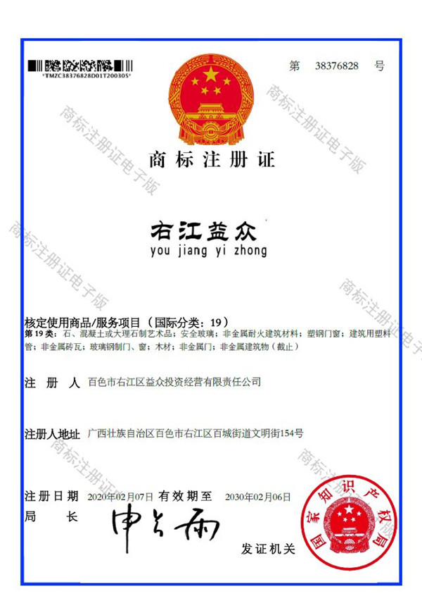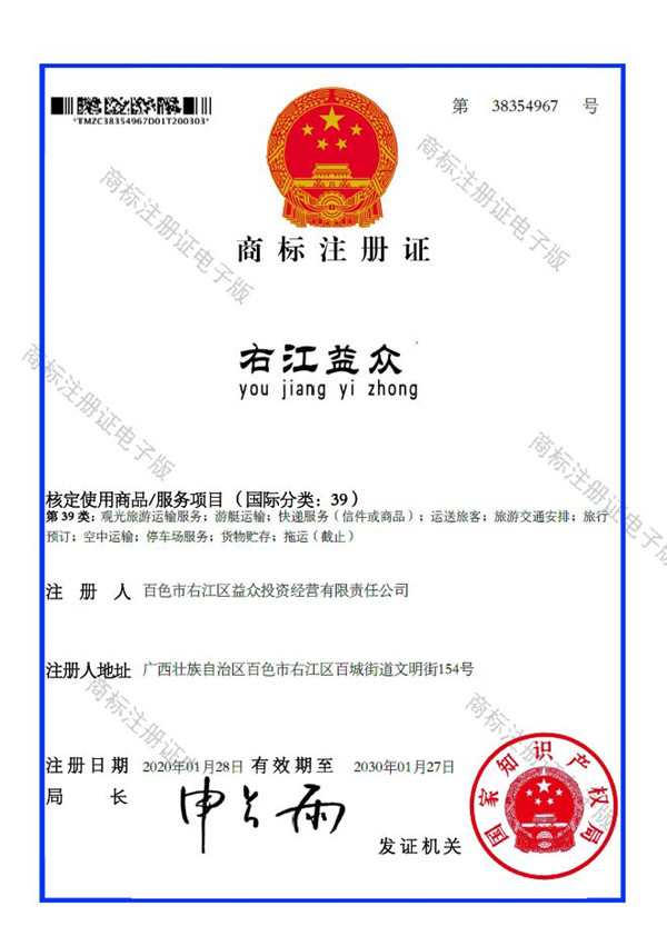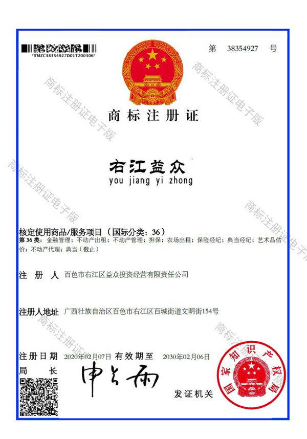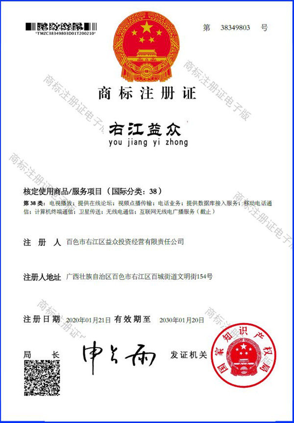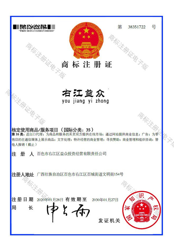 2019年4月,為樹立企業(yè)品牌形象,充分展現(xiàn)品牌價值,廣西百色益眾投資有限公司按照建設(shè)現(xiàn)代企業(yè)的方向和標準,啟動品牌商標注冊申報工作,經(jīng)過6個月的審核期和3個月的公告期,“右江益眾”45個大類商標品牌第一時間成功獲批?!坝医姹姟逼放频某晒ψ裕欣诠靖玫貐⑴c市場競爭,同時,對于強化企業(yè)內(nèi)部管理、樹立良好的企業(yè)形象、提升公司美譽度也可起到積極的助推作用。