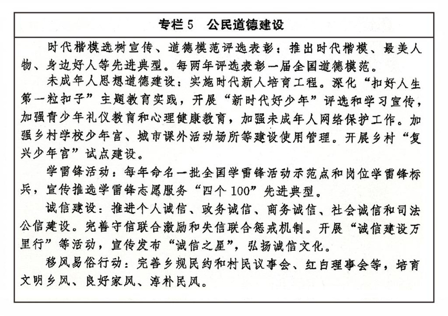 傳承弘揚中華傳統(tǒng)美德,加強社會公德、職業(yè)道德、家庭美德、個人品德建設(shè),加強家庭、家教、家風(fēng)建設(shè)。加強對革命、建設(shè)、改革時期各類先進典型的學(xué)習(xí)宣傳,尊崇褒揚英雄模范,關(guān)心關(guān)愛先進典型人物。健全家庭、學(xué)校、政府、社會相結(jié)合的思想道德教育體系,把立德樹人貫穿學(xué)校教育全過程。發(fā)揮優(yōu)秀文化產(chǎn)品陶冶道德情操的作用,完善市民公約、鄉(xiāng)規(guī)民約、學(xué)生守則、團體章程等社會規(guī)范,廣泛開展弘揚時代新風(fēng)行動,深化道德領(lǐng)域突出問題治理。加強農(nóng)村思想道德建設(shè),創(chuàng)新文化科技衛(wèi)生“三下鄉(xiāng)”長效機制。