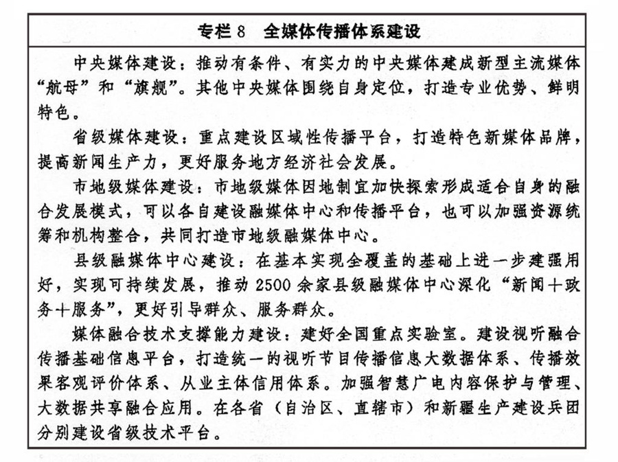 加快推進媒體深度融合發(fā)展,有效整合各種媒介資源、生產(chǎn)要素,推動在信息內(nèi)容、技術(shù)應(yīng)用、平臺終端、管理手段等方面共融互通,打造一批具有強大影響力、競爭力的新型主流媒體。統(tǒng)籌處理好傳統(tǒng)媒體和新興媒體、中央媒體和地方媒體、主流媒體和商業(yè)平臺、大眾化媒體和專業(yè)性媒體的關(guān)系,建立以內(nèi)容建設(shè)為根本、先進技術(shù)為支撐、創(chuàng)新管理為保障的全媒體傳播體系。推進內(nèi)容生產(chǎn)供給側(cè)結(jié)構(gòu)性改革,完善高質(zhì)量內(nèi)容產(chǎn)出機制,推廣互動式、服務(wù)式、場景式傳播。強化新一代信息技術(shù)支撐引領(lǐng)作用,支持主流媒體重塑采編流程、建設(shè)平臺終端、優(yōu)化管理手段、強化版權(quán)保護、打造媒體資源數(shù)據(jù)庫、提升內(nèi)容生產(chǎn)力、占據(jù)傳播制高點。創(chuàng)新媒體業(yè)態(tài)、傳播方式和運營模式,強化用戶連接,發(fā)揮制度優(yōu)勢和市場作用,增強主流媒體競爭力。