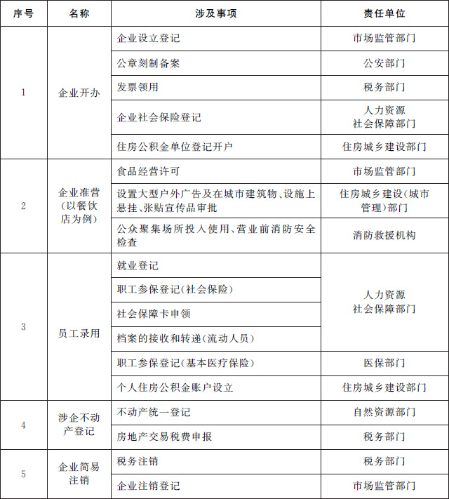 (一)推進(jìn)企業(yè)全生命周期相關(guān)政務(wù)服務(wù)事項“一件事一次辦”。圍繞企業(yè)從開辦到注銷全生命周期的重要階段,梳理集成同一階段內(nèi)需要到政府部門、公用企事業(yè)單位和服務(wù)機構(gòu)辦理的多個單一政務(wù)服務(wù)事項,為企業(yè)提供開辦、工程建設(shè)、生產(chǎn)經(jīng)營、惠企政策兌現(xiàn)、員工錄用、不動產(chǎn)登記、注銷等集成化辦理服務(wù),提高辦事效率,降低辦事成本。
