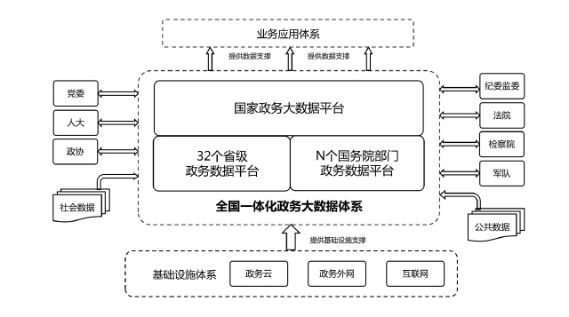 全國一體化政務(wù)大數(shù)據(jù)體系包括三類平臺和三大支撐。三類平臺為“1+32+N”框架結(jié)構(gòu)?!?”是指國家政務(wù)大數(shù)據(jù)平臺,是我國政務(wù)數(shù)據(jù)管理的總樞紐、政務(wù)數(shù)據(jù)流轉(zhuǎn)的總通道、政務(wù)數(shù)據(jù)服務(wù)的總門戶;“32”是指31個省(自治區(qū)、直轄市)和新疆生產(chǎn)建設(shè)兵團(tuán)統(tǒng)籌建設(shè)的省級政務(wù)數(shù)據(jù)平臺,負(fù)責(zé)本地區(qū)政務(wù)數(shù)據(jù)的目錄編制、供需對接、匯聚整合、共享開放,與國家平臺實現(xiàn)級聯(lián)對接;“N”是指國務(wù)院有關(guān)部門的政務(wù)數(shù)據(jù)平臺,負(fù)責(zé)本部門本行業(yè)數(shù)據(jù)匯聚整合與供需對接,與國家平臺實現(xiàn)互聯(lián)互通,尚未建設(shè)政務(wù)數(shù)據(jù)平臺的部門,可由國家平臺提供服務(wù)支撐。三大支撐包括管理機(jī)制、標(biāo)準(zhǔn)規(guī)范、安全保障三個方面。