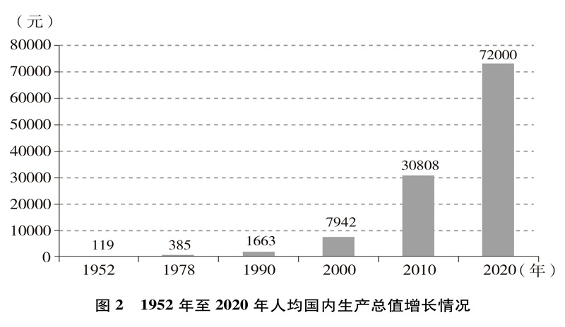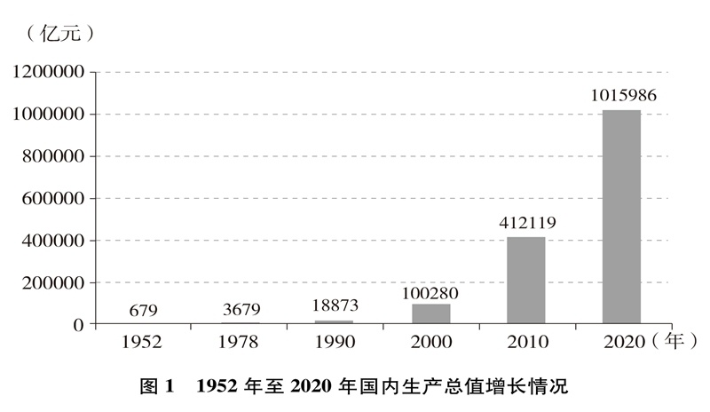 經(jīng)濟(jì)實(shí)力大幅提升。中國(guó)國(guó)內(nèi)生產(chǎn)總值從1952年的679.1億元躍升至2020年的101.6萬億元,經(jīng)濟(jì)總量占全球經(jīng)濟(jì)比重超過17%,穩(wěn)居世界第二大經(jīng)濟(jì)體(圖1)。人均國(guó)內(nèi)生產(chǎn)總值從1952年的幾十美元增至2020年的超過1萬美元,實(shí)現(xiàn)從低收入國(guó)家到中等偏上收入國(guó)家的歷史性跨越(圖2)。制造業(yè)增加值多年位居世界首位,220多種工業(yè)產(chǎn)品產(chǎn)量居世界第一,自2010年起連續(xù)11年位居世界第一制造業(yè)大國(guó)。中國(guó)已是全球貨物貿(mào)易第一大國(guó)、服務(wù)貿(mào)易第二大國(guó)、商品消費(fèi)第二大國(guó)、外匯儲(chǔ)備第一大國(guó),2020年利用外資居全球第一。不斷邁向共同富裕的14億多人口,其中有超過4億并不斷擴(kuò)大的中等收入群體,是全球最具成長(zhǎng)性的超大規(guī)模市場(chǎng),中國(guó)經(jīng)濟(jì)充滿活力,具有巨大潛力和充足后勁。2020年,中國(guó)率先控制新冠肺炎疫情,率先復(fù)工復(fù)產(chǎn),率先實(shí)現(xiàn)經(jīng)濟(jì)增長(zhǎng)由負(fù)轉(zhuǎn)正,充分彰顯中國(guó)經(jīng)濟(jì)的強(qiáng)勁韌性。