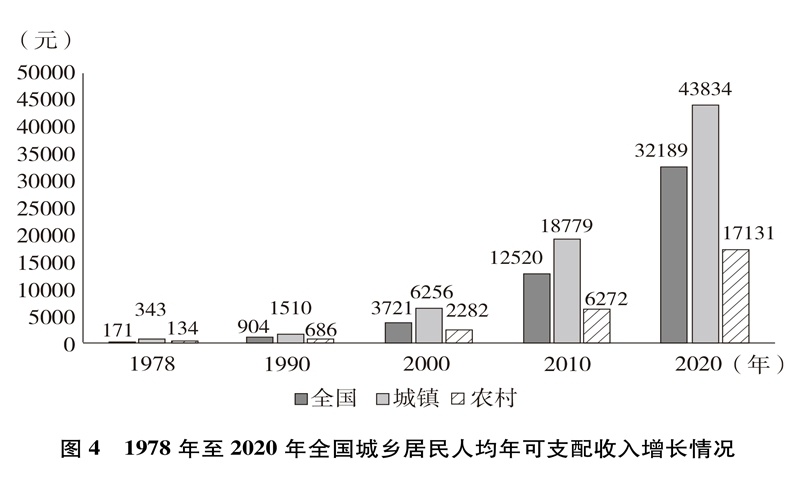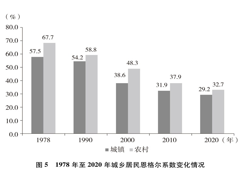 人民生活水平顯著提高。居民收入持續(xù)增加,全國(guó)居民人均年可支配收入從1978年的171元增加到2020年的32189元(圖4)。城鄉(xiāng)居民恩格爾系數(shù)分別從1978年的57.5%、67.7%下降到2020年的29.2%、32.7%(圖5),城鄉(xiāng)居民生活質(zhì)量不斷提升。溫飽問題解決后,人們對(duì)生活品質(zhì)、品位有了更高的追求,衣食住行不斷升級(jí),消費(fèi)結(jié)構(gòu)從生存型逐漸向發(fā)展型、享受型過渡。衣,從穿暖到穿美、穿出時(shí)尚;食,從吃飽到吃好、吃出健康;住,從有所居到更敞亮、更宜居;行,從便利通暢到快捷舒適。吃穿用有余,家電全面普及,乘用汽車快速進(jìn)入尋常百姓家。餐飲、健康、教育、旅游、文娛等服務(wù)性消費(fèi)持續(xù)快速增長(zhǎng),在居民人均消費(fèi)支出中占比逐漸達(dá)到一半左右。越來越多的人有“錢”有“閑”,“詩和遠(yuǎn)方”更加觸手可及,“說走就走”不再是夢(mèng)想,旅游扮靚人們的幸福生活,中國(guó)正在進(jìn)入大眾旅游時(shí)代。