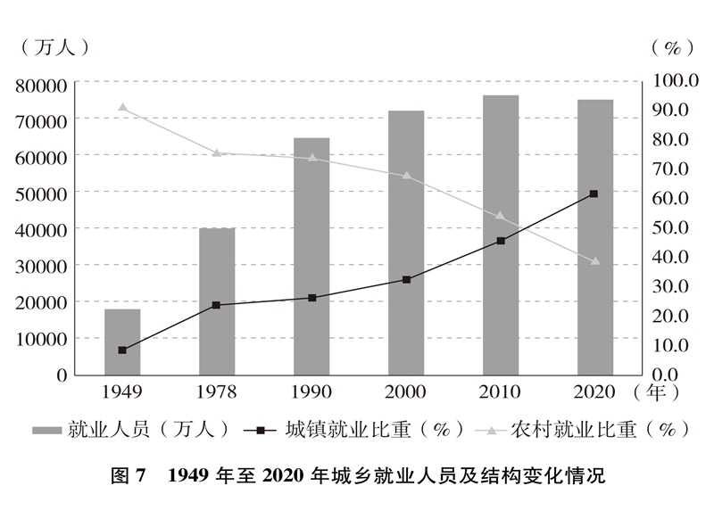 就業(yè)局勢(shì)長(zhǎng)期穩(wěn)定,就業(yè)質(zhì)量顯著提升。就業(yè)人數(shù)從1949年的1.8億增加到2020年的7.5億,就業(yè)規(guī)模不斷擴(kuò)大;從絕大多數(shù)勞動(dòng)者以農(nóng)業(yè)為生到第三產(chǎn)業(yè)就業(yè)人數(shù)占47.7%(圖6)、城鎮(zhèn)就業(yè)人數(shù)占61.6%(圖7),就業(yè)結(jié)構(gòu)不斷優(yōu)化;從勞動(dòng)者普遍處于文盲半文盲狀態(tài)到勞動(dòng)年齡人口平均受教育年限10.8年、技能人才總量約2億,就業(yè)人員素質(zhì)大幅提高。億萬勞動(dòng)者擁有自己熱愛的工作,開啟幸福生活的大門。從計(jì)劃分配到市場(chǎng)就業(yè)、自由擇業(yè)、自主創(chuàng)業(yè),從傳統(tǒng)就業(yè)方式到新就業(yè)形態(tài),勞動(dòng)者的就業(yè)觀念深刻變革、就業(yè)空間更加廣闊、就業(yè)方式日益多元。人們的興趣愛好、特長(zhǎng)稟賦與個(gè)人就業(yè)意愿、社會(huì)需求、國(guó)家需要更好結(jié)合,自我價(jià)值更好實(shí)現(xiàn),主動(dòng)性創(chuàng)造性顯著增強(qiáng),創(chuàng)新創(chuàng)造熱情不斷迸發(fā)。勞動(dòng)者合法權(quán)益得到保障,勞動(dòng)報(bào)酬保持增長(zhǎng),勞動(dòng)所得受到保護(hù),人們?cè)絹碓接凶饑?yán)地勞動(dòng)、快樂地勞動(dòng),依靠自己的雙手創(chuàng)造美好生活。從“單休制”到“雙休制”,從“黃金周”到帶薪年休假,勞動(dòng)者休息休假權(quán)益越來越有保障,工作生活更加平衡。勞動(dòng)最光榮、最崇高、最偉大、最美麗日益成為全社會(huì)的共識(shí)和行動(dòng),勤奮做事、勤勉為人、勤勞致富成為風(fēng)尚,崇尚勞動(dòng)、尊重勞動(dòng)、熱愛勞動(dòng)的社會(huì)氛圍更加濃厚。