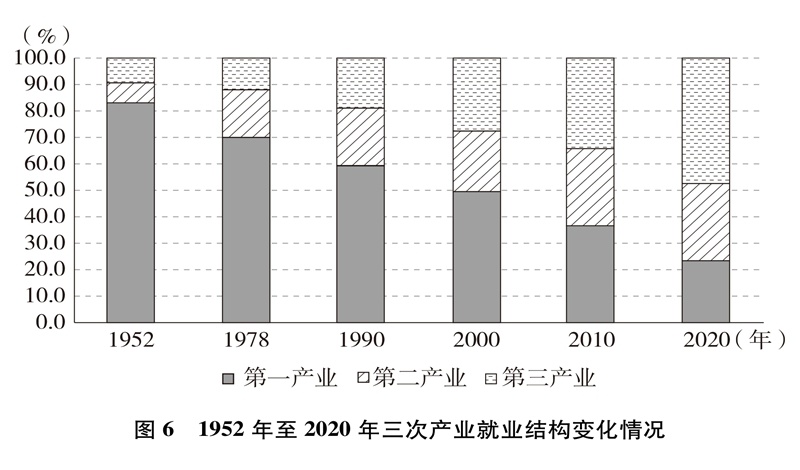 產(chǎn)業(yè)結(jié)構(gòu)優(yōu)化升級(jí)。中國(guó)已建成世界上最完整的產(chǎn)業(yè)體系,產(chǎn)業(yè)發(fā)展持續(xù)向中高端邁進(jìn)。三次產(chǎn)業(yè)增加值之比從1952年的50.5∶20.8∶28.7到2020年的7.7∶37.8∶54.5,中國(guó)從傳統(tǒng)農(nóng)業(yè)大國(guó)成為工業(yè)大國(guó)、服務(wù)業(yè)大國(guó)(圖3),中國(guó)經(jīng)濟(jì)從依賴單一產(chǎn)業(yè)為主轉(zhuǎn)向依靠三次產(chǎn)業(yè)共同帶動(dòng)。農(nóng)業(yè)現(xiàn)代化成效顯著,機(jī)械化、數(shù)字化、綠色化、功能化、共享化水平明顯提高,廣大農(nóng)民逐步告別“面朝黃土背朝天、一身力氣百身汗”的辛勞,農(nóng)村生產(chǎn)力極大解放;糧食生產(chǎn)能力穩(wěn)步提升,實(shí)現(xiàn)谷物基本自給,中國(guó)人把飯碗牢牢端在自己手中。中國(guó)建成門類齊全、獨(dú)立完整的現(xiàn)代工業(yè)體系,工業(yè)化和信息化融合發(fā)展的廣度和深度不斷拓展,“中國(guó)制造”向“中國(guó)智造”轉(zhuǎn)型升級(jí),產(chǎn)業(yè)鏈供應(yīng)鏈現(xiàn)代化水平進(jìn)一步提升。以新一代信息技術(shù)、生物技術(shù)、高端裝備、綠色環(huán)保為代表的戰(zhàn)略性新興產(chǎn)業(yè)發(fā)展迅速,成為引領(lǐng)高質(zhì)量發(fā)展的重要引擎。數(shù)字經(jīng)濟(jì)激發(fā)經(jīng)濟(jì)發(fā)展新活力,產(chǎn)業(yè)數(shù)字化和數(shù)字產(chǎn)業(yè)化趨勢(shì)加快。現(xiàn)代服務(wù)業(yè)加速發(fā)展,以“互聯(lián)網(wǎng)+”為標(biāo)志的新業(yè)態(tài)、新模式層出不窮,平臺(tái)經(jīng)濟(jì)、共享經(jīng)濟(jì)蓬勃興起,生產(chǎn)性服務(wù)業(yè)向?qū)I(yè)化和高端化發(fā)展,生活性服務(wù)業(yè)向精細(xì)化和高品質(zhì)轉(zhuǎn)變。產(chǎn)業(yè)結(jié)構(gòu)的優(yōu)化升級(jí)促進(jìn)了經(jīng)濟(jì)更加均衡、更加充分的發(fā)展,人們個(gè)性化品質(zhì)化多樣化需求不斷得到滿足。