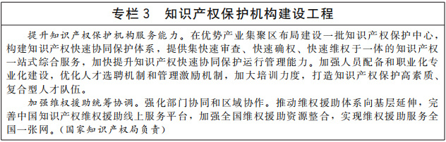 健全知識產(chǎn)權(quán)行政保護機制。加強中央在知識產(chǎn)權(quán)保護的宏觀管理、區(qū)域協(xié)調(diào)和涉外事宜統(tǒng)籌等方面事權(quán)。加強知識產(chǎn)權(quán)快保護機構(gòu)建設(shè)。在條件成熟的地區(qū)建設(shè)國家知識產(chǎn)權(quán)保護試點示范區(qū)。加強知識產(chǎn)權(quán)行政執(zhí)法指導制度建設(shè)。建立行政保護技術(shù)調(diào)查官制度。健全知識產(chǎn)權(quán)侵權(quán)糾紛行政裁決制度。健全跨區(qū)域、跨部門知識產(chǎn)權(quán)行政保護協(xié)作機制。加強商貿(mào)流通領(lǐng)域知識產(chǎn)權(quán)保護,制定商品交易市場知識產(chǎn)權(quán)保護國家規(guī)范,持續(xù)推進知識產(chǎn)權(quán)保護規(guī)范化市場建設(shè),凈化消費市場。(國家知識產(chǎn)權(quán)局牽頭,中央宣傳部、文化和旅游部、市場監(jiān)管總局等按職責分工負責)