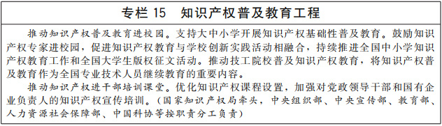 構(gòu)建知識產(chǎn)權(quán)大宣傳格局。圍繞知識產(chǎn)權(quán)強國建設(shè),統(tǒng)籌傳統(tǒng)媒體與新興媒體,用好融媒體,健全知識產(chǎn)權(quán)新聞發(fā)布制度。建立健全政府活動宣傳、媒體傳播報道、學界文章影響、國際文化交流相互促進的知識產(chǎn)權(quán)傳播大矩陣。持續(xù)做好全國知識產(chǎn)權(quán)宣傳周、中國知識產(chǎn)權(quán)年會等品牌宣傳活動。講好中國知識產(chǎn)權(quán)故事,展示文明大國、負責任大國形象。(國家知識產(chǎn)權(quán)局牽頭,中央宣傳部、中央網(wǎng)信辦、廣電總局等按職責分工負責)