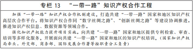 加強知識產(chǎn)權(quán)國際合作機制建設(shè)。鞏固和完善“一帶一路”知識產(chǎn)權(quán)合作,充分利用“一帶一路”知識產(chǎn)權(quán)合作平臺,擴大合作項目規(guī)模和儲備。深度參與金磚國家、中美歐日韓、中日韓、中國—東盟等小多邊知識產(chǎn)權(quán)合作,加強與各方政策和業(yè)務規(guī)則交流,支持產(chǎn)業(yè)界積極參與相關(guān)合作機制。完善跨境司法協(xié)作安排,加強防范打擊侵犯知識產(chǎn)權(quán)犯罪國際合作。(中央宣傳部、最高人民法院、最高人民檢察院、外交部、公安部、商務部、海關(guān)總署、國家知識產(chǎn)權(quán)局等按職責分工負責)