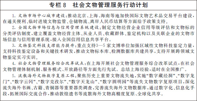 堅持社會效益優(yōu)先,加強(qiáng)對民間收藏的指導(dǎo)、管理和服務(wù),健全文物合法流通交易體制機(jī)制,優(yōu)化文物鑒定服務(wù)和文物進(jìn)出境監(jiān)管,完善流失文物追索返還制度。