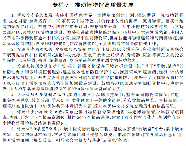 創(chuàng)新文物保護(hù)利用機(jī)制,加強(qiáng)文物和文化遺產(chǎn)保護(hù)利用,建設(shè)國家文物保護(hù)利用示范區(qū)。健全國有文物資源資產(chǎn)管理制度,推進(jìn)文物資源資產(chǎn)管理信息共享,部署開展相關(guān)試點工作。完善各方主體參與文物保護(hù)利用的支持政策,保障利益相關(guān)方合法權(quán)益。探索創(chuàng)新對文物資源密集區(qū)的支持方式。建設(shè)文物領(lǐng)域國家智庫。