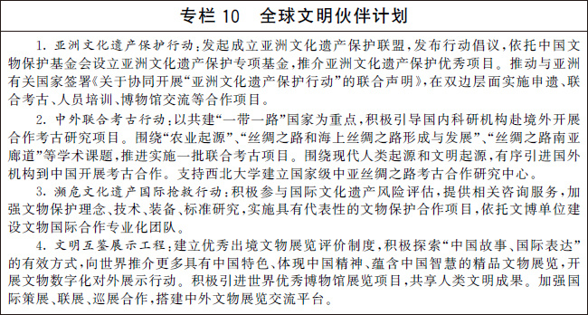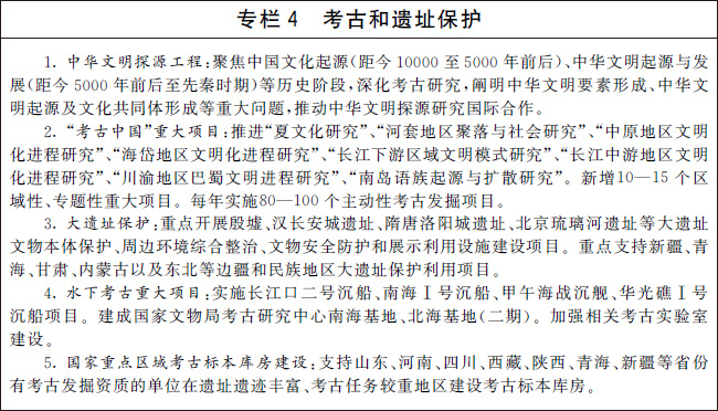 編制并實施“十四五”考古工作專項規(guī)劃。系統(tǒng)確定考古發(fā)掘重點,深化中華文明探源工程,推進(jìn)“考古中國”重大項目,科學(xué)闡釋中國境內(nèi)人類起源、文明起源、中華文明形成、統(tǒng)一多民族國家建立和發(fā)展、中華文明在世界文明史中的重要地位等關(guān)鍵問題,揭示中華文明的歷史文化價值和核心特質(zhì)。
