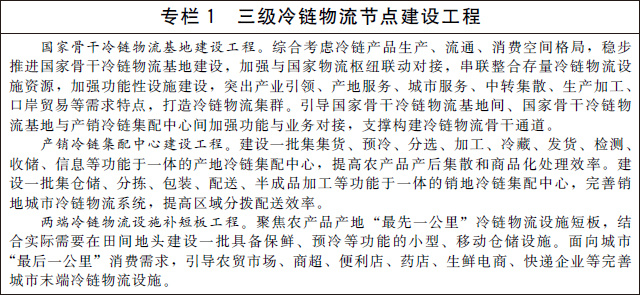 ——基礎(chǔ)設(shè)施更加完善。依托農(nóng)產(chǎn)品優(yōu)勢(shì)產(chǎn)區(qū)、重要集散地和主銷區(qū),布局建設(shè)100個(gè)左右國(guó)家骨干冷鏈物流基地;圍繞服務(wù)農(nóng)產(chǎn)品產(chǎn)地集散、優(yōu)化冷鏈產(chǎn)品銷地網(wǎng)絡(luò),建設(shè)一批產(chǎn)銷冷鏈集配中心;聚焦產(chǎn)地“最先一公里”和城市“最后一公里”,補(bǔ)齊兩端冷鏈物流設(shè)施短板,基本建成以國(guó)家骨干冷鏈物流基地為核心、產(chǎn)銷冷鏈集配中心和兩端冷鏈物流設(shè)施為支撐的三級(jí)冷鏈物流節(jié)點(diǎn)設(shè)施網(wǎng)絡(luò),支撐冷鏈物流深度融入“通道+樞紐+網(wǎng)絡(luò)”現(xiàn)代物流運(yùn)行體系,與國(guó)家物流網(wǎng)絡(luò)實(shí)現(xiàn)協(xié)同建設(shè)、融合發(fā)展。