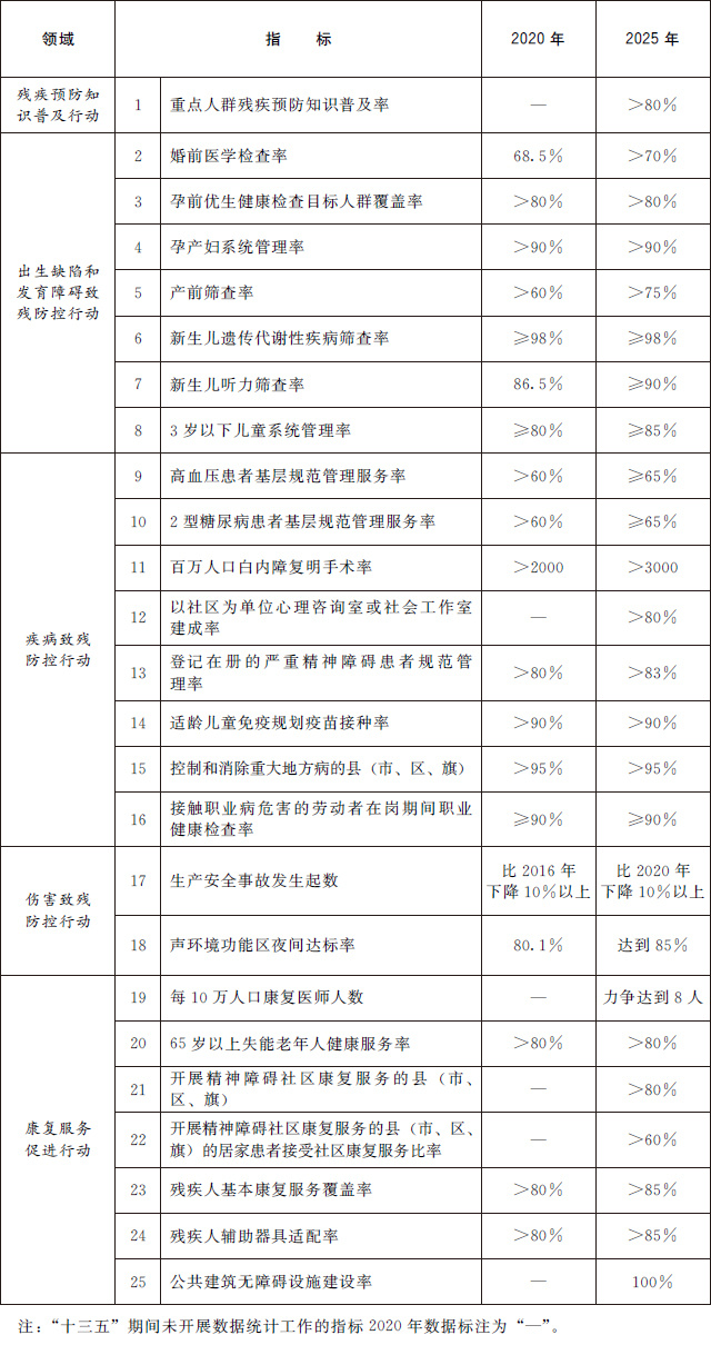 到2025年,覆蓋經(jīng)濟社會發(fā)展各領(lǐng)域的殘疾預(yù)防政策體系進一步完善,全人群全生命周期殘疾預(yù)防服務(wù)網(wǎng)絡(luò)更加健全,全民殘疾預(yù)防素養(yǎng)明顯提升,遺傳和發(fā)育、疾病、傷害等主要致殘因素得到有效防控,殘疾康復(fù)服務(wù)狀況持續(xù)改善,殘疾預(yù)防主要指標處于中高收入國家前列。