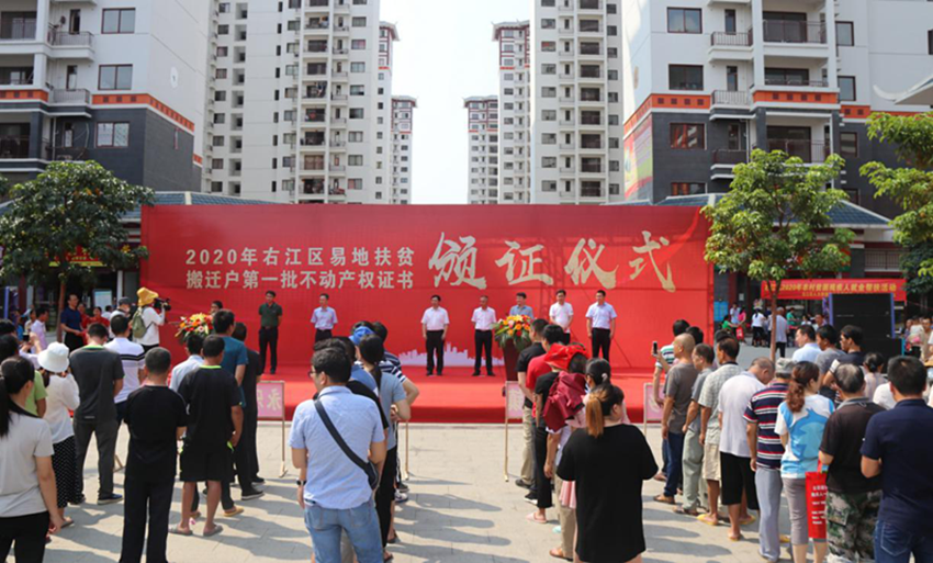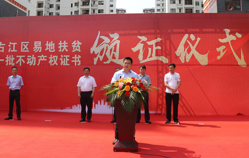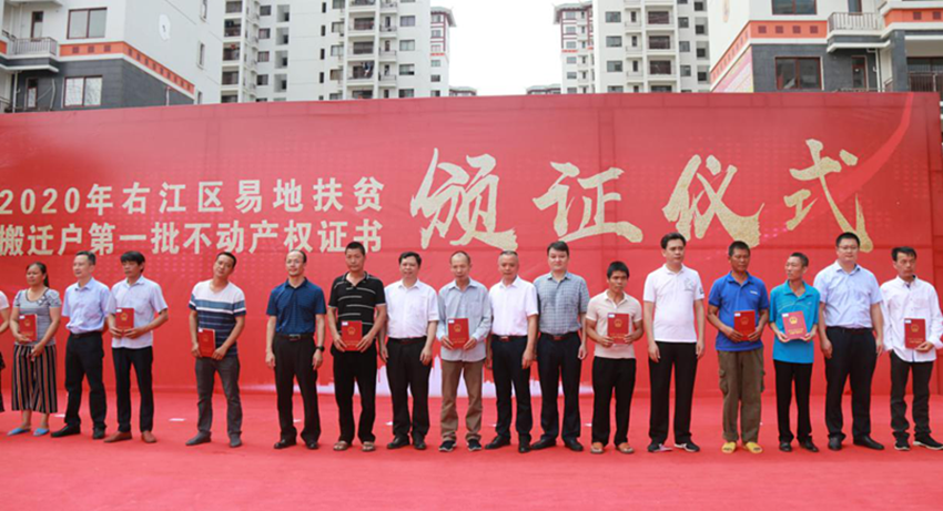 5月16日上午,右江區(qū)“老鄉(xiāng)家園—迎龍易地扶貧搬遷安置小鎮(zhèn)”搬遷戶不動(dòng)產(chǎn)權(quán)證書頒證儀式在安置小鎮(zhèn)舉行,第一批26戶搬遷戶順利拿到了產(chǎn)權(quán)證書。百色市發(fā)改委副主任、市水庫(kù)和扶貧易地安置管理局局長(zhǎng)羅加攀,右江區(qū)委常委、區(qū)人民政府副區(qū)長(zhǎng)岑萬(wàn)興,右江區(qū)委常委、宣傳部部長(zhǎng)、區(qū)人民政府副區(qū)長(zhǎng)王世凡,右江區(qū)委常委、辦公室主任盧靈及右江區(qū)直單位、鄉(xiāng)鎮(zhèn)代表,廣西百色益眾投資有限公司董事長(zhǎng)、總經(jīng)理趙家臣出席儀式。儀式由王世凡主持。