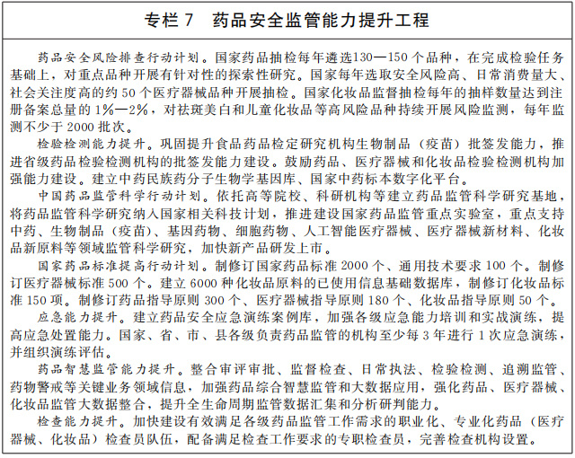 完善藥品安全監(jiān)管制度。加強(qiáng)藥物臨床試驗(yàn)核查,嚴(yán)格執(zhí)行藥品、醫(yī)療器械、化妝品等生產(chǎn)質(zhì)量管理規(guī)范,對(duì)重點(diǎn)生產(chǎn)企業(yè)開(kāi)展全覆蓋檢查。開(kāi)展藥品質(zhì)量提升行動(dòng),健全生物制品等高風(fēng)險(xiǎn)產(chǎn)品標(biāo)準(zhǔn)制定工作機(jī)制,提高藥品、醫(yī)療器械、化妝品標(biāo)準(zhǔn)。改革和完善疫苗監(jiān)管體制機(jī)制,提高省級(jí)藥品檢驗(yàn)檢測(cè)機(jī)構(gòu)對(duì)轄區(qū)內(nèi)生產(chǎn)的主要疫苗品種批簽發(fā)能力。深入開(kāi)展無(wú)菌植入性醫(yī)療器械監(jiān)督檢查、化妝品“線上凈網(wǎng)、線下清源”等專(zhuān)項(xiàng)整治行動(dòng),切實(shí)規(guī)范藥品、醫(yī)療器械、化妝品市場(chǎng)秩序。