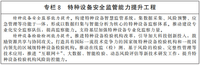 強(qiáng)化特種設(shè)備安全風(fēng)險(xiǎn)監(jiān)控體系建設(shè)。優(yōu)化特種設(shè)備監(jiān)管信息化建設(shè)基礎(chǔ)和應(yīng)用環(huán)境,推動(dòng)國(guó)家與地方監(jiān)管數(shù)據(jù)互聯(lián)互通,增強(qiáng)數(shù)據(jù)分析和信用管理功能,完善全國(guó)統(tǒng)一的特種設(shè)備信息公示查詢(xún)系統(tǒng)。加強(qiáng)特種設(shè)備風(fēng)險(xiǎn)預(yù)警與應(yīng)急處置能力建設(shè),提高安全風(fēng)險(xiǎn)識(shí)別和防控能力。推動(dòng)特種設(shè)備使用單位開(kāi)展風(fēng)險(xiǎn)分級(jí)管控,從源頭上系統(tǒng)辨識(shí)風(fēng)險(xiǎn)、防控風(fēng)險(xiǎn)。完善生產(chǎn)單位、檢驗(yàn)檢測(cè)機(jī)構(gòu)和人員資格信息等特種設(shè)備基礎(chǔ)數(shù)據(jù)庫(kù)。以電梯、氣瓶和移動(dòng)式壓力容器、叉車(chē)等為重點(diǎn),建立健全特種設(shè)備質(zhì)量安全管理追溯體系。推動(dòng)特種設(shè)備生產(chǎn)企業(yè)加大研發(fā)投入,建立科學(xué)嚴(yán)密、反應(yīng)及時(shí)的風(fēng)險(xiǎn)防范系統(tǒng)。完善鍋爐安全、節(jié)能、環(huán)保三位一體的監(jiān)管體系,以實(shí)現(xiàn)碳達(dá)峰碳中和目標(biāo)為導(dǎo)向,進(jìn)一步提升鍋爐節(jié)能環(huán)保水平。