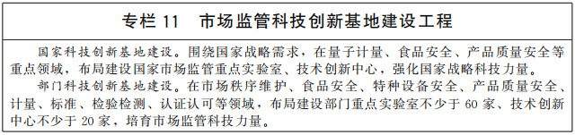 加強(qiáng)科技支撐體系建設(shè)。鼓勵(lì)市場(chǎng)監(jiān)管領(lǐng)域科研創(chuàng)新,加強(qiáng)市場(chǎng)監(jiān)管重點(diǎn)領(lǐng)域關(guān)鍵技術(shù)攻關(guān)和先進(jìn)裝備研制,布局一批國(guó)家和部門(mén)科技創(chuàng)新基地。重點(diǎn)推進(jìn)中國(guó)標(biāo)準(zhǔn)化研究院國(guó)家標(biāo)準(zhǔn)館建設(shè)工程和昌平實(shí)驗(yàn)基地二期建設(shè)工程、中國(guó)計(jì)量科學(xué)研究院實(shí)驗(yàn)基地二期建設(shè)工程、國(guó)家食品質(zhì)量安全檢(監(jiān))測(cè)能力建設(shè)工程、國(guó)家消費(fèi)品質(zhì)量安全風(fēng)險(xiǎn)監(jiān)測(cè)預(yù)警能力建設(shè)工程等建設(shè),全面提升市場(chǎng)監(jiān)管科技支撐能力。