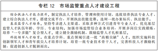 加強(qiáng)人才隊(duì)伍建設(shè)。健全人才引進(jìn)、培養(yǎng)、使用、評(píng)價(jià)、激勵(lì)機(jī)制,統(tǒng)籌推進(jìn)市場(chǎng)監(jiān)管人才隊(duì)伍建設(shè)。加快高水平市場(chǎng)監(jiān)管智庫(kù)和綜合型研究機(jī)構(gòu)建設(shè),加強(qiáng)重大理論和實(shí)踐問(wèn)題戰(zhàn)略研究、決策咨詢(xún),開(kāi)展人才需求分析。推進(jìn)市場(chǎng)監(jiān)管人才培養(yǎng),加快相關(guān)學(xué)科專(zhuān)業(yè)建設(shè),培養(yǎng)符合市場(chǎng)監(jiān)管現(xiàn)代化需求的后備人才。在檢驗(yàn)檢測(cè)、藥品審評(píng)、檢查核查、網(wǎng)絡(luò)數(shù)據(jù)監(jiān)管、知識(shí)產(chǎn)權(quán)、質(zhì)量技術(shù)等重點(diǎn)專(zhuān)業(yè)領(lǐng)域,著力培養(yǎng)引進(jìn)一批“高精尖缺”人才。組織開(kāi)展綜合執(zhí)法大練兵,提升基層人才隊(duì)伍能力水平。加強(qiáng)市場(chǎng)監(jiān)管文化建設(shè),增進(jìn)價(jià)值認(rèn)同、情感認(rèn)同、文化認(rèn)同,增強(qiáng)做好市場(chǎng)監(jiān)管工作的責(zé)任感和使命感。