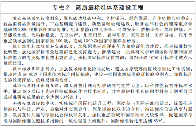 深化標(biāo)準(zhǔn)化改革創(chuàng)新。加快標(biāo)準(zhǔn)供給由政府主導(dǎo)向政府與市場(chǎng)并重轉(zhuǎn)變,標(biāo)準(zhǔn)運(yùn)用由產(chǎn)業(yè)與貿(mào)易為主向經(jīng)濟(jì)社會(huì)全域轉(zhuǎn)變,標(biāo)準(zhǔn)化工作由國(guó)內(nèi)驅(qū)動(dòng)向國(guó)內(nèi)國(guó)際相互促進(jìn)轉(zhuǎn)變,標(biāo)準(zhǔn)化發(fā)展由數(shù)量規(guī)模型向質(zhì)量效益型轉(zhuǎn)變。持續(xù)優(yōu)化政府頒布標(biāo)準(zhǔn)與市場(chǎng)自主制定標(biāo)準(zhǔn)協(xié)調(diào)配合的新型標(biāo)準(zhǔn)體系,推動(dòng)一般性產(chǎn)品、服務(wù)標(biāo)準(zhǔn)由市場(chǎng)自主制定,建立健全政府頒布標(biāo)準(zhǔn)采信市場(chǎng)自主制定標(biāo)準(zhǔn)的機(jī)制。建立法規(guī)引用標(biāo)準(zhǔn)制度,強(qiáng)化法規(guī)與標(biāo)準(zhǔn)有效協(xié)調(diào)機(jī)制,運(yùn)用標(biāo)準(zhǔn)支撐法規(guī)落地實(shí)施。加強(qiáng)標(biāo)準(zhǔn)化技術(shù)組織建設(shè),提升國(guó)家標(biāo)準(zhǔn)研制和實(shí)施能力。加強(qiáng)國(guó)家技術(shù)標(biāo)準(zhǔn)創(chuàng)新基地和國(guó)家級(jí)標(biāo)準(zhǔn)驗(yàn)證檢驗(yàn)檢測(cè)點(diǎn)建設(shè),提升標(biāo)準(zhǔn)化技術(shù)支撐水平。實(shí)施標(biāo)準(zhǔn)全生命周期閉環(huán)管理,完善標(biāo)準(zhǔn)實(shí)施信息反饋與評(píng)估制度,建立國(guó)家標(biāo)準(zhǔn)動(dòng)態(tài)維護(hù)機(jī)制。開(kāi)展對(duì)標(biāo)達(dá)標(biāo)專(zhuān)項(xiàng)行動(dòng),推動(dòng)團(tuán)體標(biāo)準(zhǔn)培優(yōu)計(jì)劃和企業(yè)標(biāo)準(zhǔn)領(lǐng)跑者制度實(shí)施,消除標(biāo)準(zhǔn)制定團(tuán)體培育發(fā)展的政策障礙,釋放企業(yè)、社會(huì)團(tuán)體標(biāo)準(zhǔn)化活力。