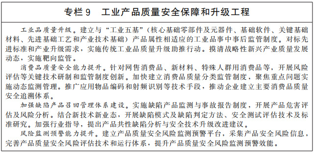 加大消費(fèi)品安全監(jiān)管力度。推動(dòng)企業(yè)建立主要消費(fèi)品質(zhì)量安全追溯體系,記錄重點(diǎn)環(huán)節(jié)過(guò)程信息,實(shí)現(xiàn)產(chǎn)品質(zhì)量安全問(wèn)題可追溯。健全缺陷產(chǎn)品召回制度,加強(qiáng)大中型客貨車(chē)、新能源汽車(chē)與智能網(wǎng)聯(lián)汽車(chē)、智能家居、兒童用品、電子電器等重點(diǎn)產(chǎn)品召回管理,強(qiáng)化重大案件調(diào)查與召回后續(xù)監(jiān)督工作,完善缺陷產(chǎn)品召回技術(shù)支撐體系。完善產(chǎn)品傷害監(jiān)測(cè)制度,拓寬監(jiān)測(cè)信息采集渠道,增加監(jiān)測(cè)點(diǎn),推進(jìn)產(chǎn)品傷害預(yù)防干預(yù)。完善產(chǎn)品質(zhì)量安全事故強(qiáng)制報(bào)告和調(diào)查處理制度,提高質(zhì)量安全事故人身傷害賠償標(biāo)準(zhǔn)。