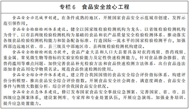 加強(qiáng)食品安全源頭治理。加強(qiáng)食品全鏈條質(zhì)量安全監(jiān)管,推進(jìn)食品安全放心工程建設(shè)攻堅(jiān)行動(dòng),加大重點(diǎn)領(lǐng)域食品安全問(wèn)題聯(lián)合整治力度。提高糧食收儲(chǔ)質(zhì)量,防止不符合食品安全標(biāo)準(zhǔn)的糧食流入口糧市場(chǎng)和食品生產(chǎn)企業(yè)。加快制修訂農(nóng)藥殘留、獸藥殘留、重金屬、食品污染物、致病性微生物等食品安全通用標(biāo)準(zhǔn),推進(jìn)產(chǎn)業(yè)發(fā)展和監(jiān)管急需的食品安全基礎(chǔ)標(biāo)準(zhǔn)、產(chǎn)品標(biāo)準(zhǔn)、標(biāo)簽標(biāo)準(zhǔn)、配套檢驗(yàn)方法標(biāo)準(zhǔn)制修訂,完善食品添加劑、食品相關(guān)產(chǎn)品等標(biāo)準(zhǔn)。加快食品相關(guān)標(biāo)準(zhǔn)樣品研制。加強(qiáng)進(jìn)口食品安全監(jiān)管,嚴(yán)防輸入型食品安全風(fēng)險(xiǎn)。實(shí)施農(nóng)產(chǎn)品原產(chǎn)地追溯促進(jìn)行動(dòng),打造追溯管理規(guī)范、市場(chǎng)機(jī)制成熟、帶動(dòng)能力強(qiáng)的農(nóng)產(chǎn)品追溯標(biāo)桿企業(yè),推動(dòng)全程追溯協(xié)作和示范推廣。