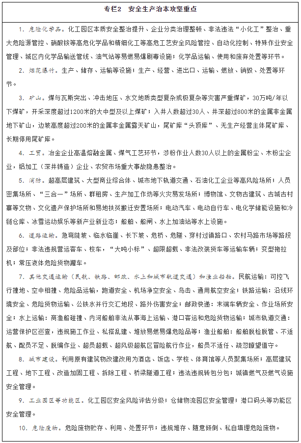 深化專項(xiàng)整治。深入推進(jìn)危險(xiǎn)化學(xué)品、礦山、消防、交通運(yùn)輸、建筑施工、民爆、特種設(shè)備、大型商業(yè)綜合體等重點(diǎn)行業(yè)領(lǐng)域安全整治,解決影響制約安全生產(chǎn)的薄弱環(huán)節(jié)和突出問題,督促企業(yè)嚴(yán)格安全管理、加大安全投入、落實(shí)風(fēng)險(xiǎn)管控措施。結(jié)合深化供給側(cè)結(jié)構(gòu)性改革,推動(dòng)安全基礎(chǔ)薄弱、安全保障能力低下且整改后仍不達(dá)標(biāo)的企業(yè)退出市場。統(tǒng)籌考慮危險(xiǎn)化學(xué)品企業(yè)搬遷和項(xiàng)目建設(shè)審批,優(yōu)先保障符合條件企業(yè)的搬遷用地。持續(xù)推進(jìn)企業(yè)安全生產(chǎn)標(biāo)準(zhǔn)化建設(shè),實(shí)現(xiàn)安全管理、操作行為、設(shè)施設(shè)備和作業(yè)環(huán)境規(guī)范化。推動(dòng)淘汰落后技術(shù)、工藝、材料和設(shè)備,加大重點(diǎn)設(shè)施設(shè)備、儀器儀表檢驗(yàn)檢測力度。推動(dòng)各類金融機(jī)構(gòu)出臺(tái)優(yōu)惠貸款等金融類產(chǎn)品,大力推廣新技術(shù)、新工藝、新材料和新裝備,實(shí)施智能化礦山、智能化工廠、數(shù)字化車間改造,開展智能化作業(yè)和危險(xiǎn)崗位機(jī)器人替代示范。強(qiáng)化危險(xiǎn)廢物全過程監(jiān)管,動(dòng)態(tài)修訂《國家危險(xiǎn)廢物名錄》,修訂危險(xiǎn)廢物鑒別、貯存以及水泥窯協(xié)同處置污染控制等標(biāo)準(zhǔn),制定完善危險(xiǎn)廢物重點(diǎn)監(jiān)管單位清單。建立廢棄危險(xiǎn)化學(xué)品等危險(xiǎn)廢物監(jiān)管協(xié)作和聯(lián)合執(zhí)法工作機(jī)制,加強(qiáng)危險(xiǎn)廢物監(jiān)管能力與應(yīng)急處置技術(shù)支持能力建設(shè)。