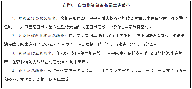 充分利用倉儲(chǔ)資源,依托現(xiàn)有中央和地方物資儲(chǔ)備庫,建設(shè)綜合應(yīng)急物資儲(chǔ)備庫。在交通樞紐城市、人口密集區(qū)域、易發(fā)生重特大自然災(zāi)害區(qū)域建設(shè)一批綜合性國家儲(chǔ)備基地。建設(shè)完善國家綜合性消防救援隊(duì)伍應(yīng)急物資儲(chǔ)備庫及戰(zhàn)勤保障站。在關(guān)鍵物流樞紐建設(shè)應(yīng)急物資調(diào)運(yùn)平臺(tái)和區(qū)域配送中心,依托大型快遞物流企業(yè)建設(shè)一批綜合應(yīng)急物資物流基地。完善國家應(yīng)急資源管理平臺(tái)和應(yīng)急物資保障數(shù)據(jù)庫,匯聚應(yīng)急物資信息。