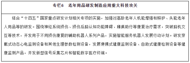 加強老年用品研發(fā)制造。大力開發(fā)滿足老年人衣、食、住、行等需求的老年生活用品。針對不同生活場景,重點開發(fā)適老化家電、家具、洗浴裝置、坐便器、廚房用品等日用產品以及智能輪椅、生物力學拐杖等輔助產品,推廣易于抓握的扶手等支撐裝置以及地面防滑產品、無障礙產品,發(fā)展老年益智類玩具、樂器等休閑陪護產品。針對機構養(yǎng)老、日間托養(yǎng)、上門護理等需求,重點開發(fā)清潔衛(wèi)生、飲食起居、生活護理等方面產品,提升成人尿褲、護理墊、潰瘍康復用品等產品的適老性能,發(fā)展輔助搬運、翻身、巡檢等機器人。發(fā)展老年人監(jiān)護、防走失定位等產品。